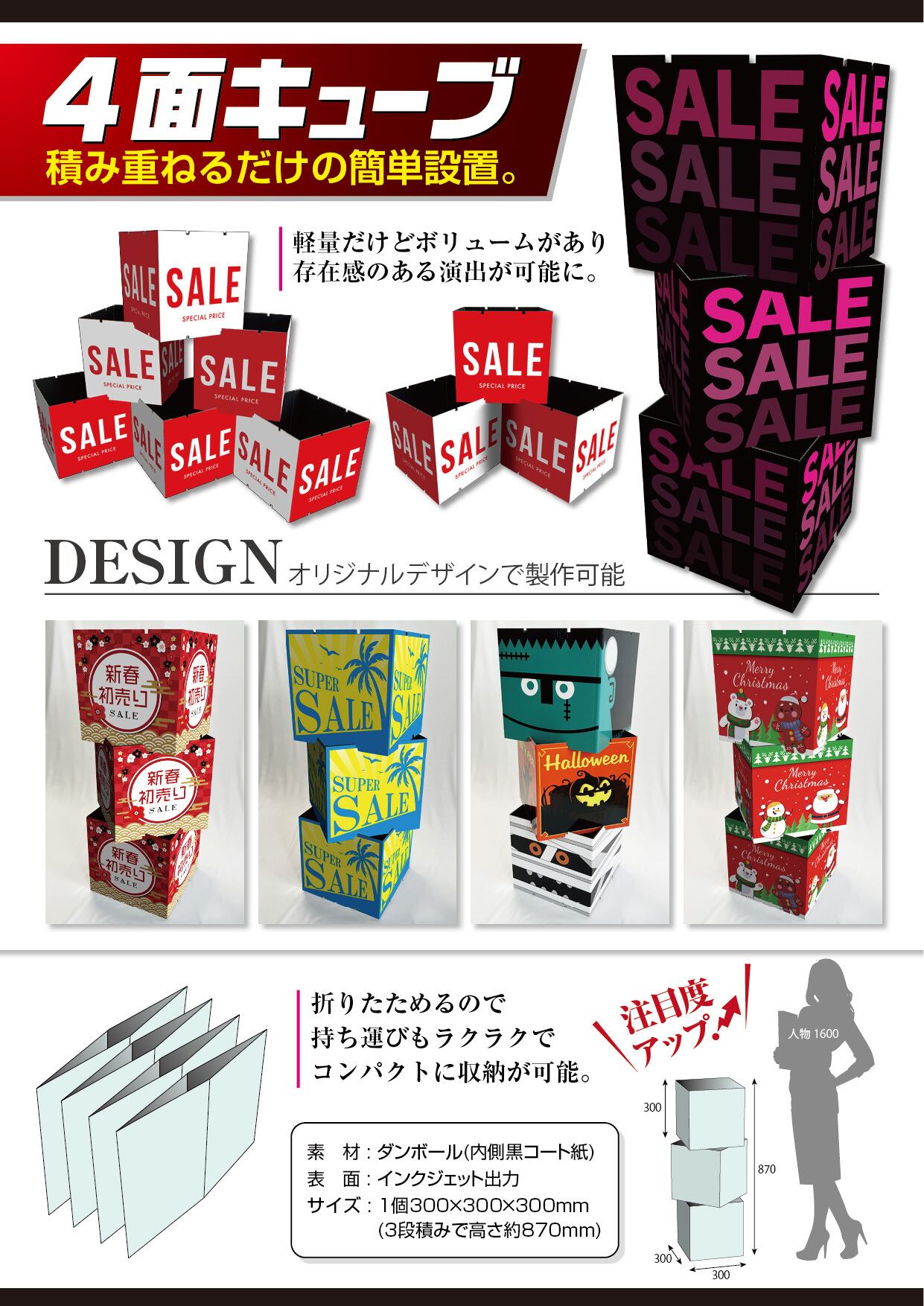 サイズはW300×H300×D300㎜で、四面全てにデザインが可能なため、360度どの角度からも視認性が抜群です。軽量で持ち運びが簡単なので、イベントや店舗でのご利用にピッタリです。